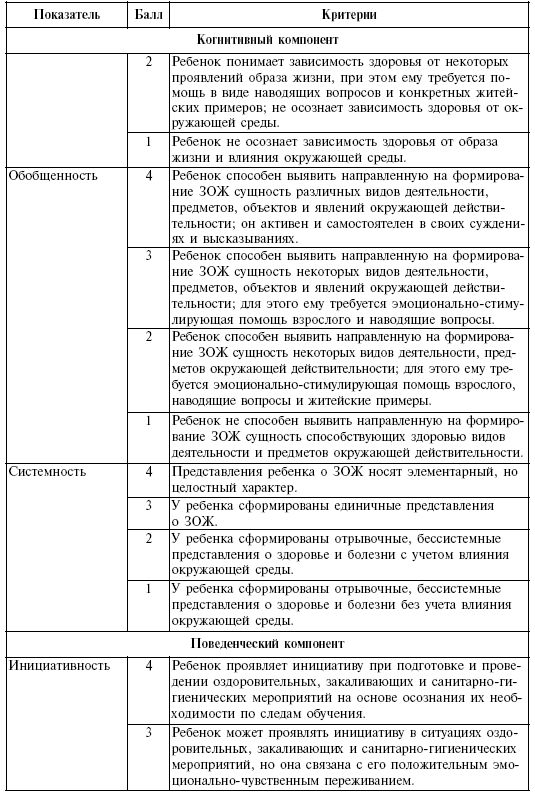 Дошкольники отличаются друг от друга по уровню развития познавательной деятельности, поэтому авторы пособия, частично опираясь на показатели и критерии оценки представлений о ЗОЖ, предложенные Л.Г. Касьяновой[1], разработали следующие показатели и критерии качественного анализа когнитивного и поведенческого компонентов представлений о здоровом образе жизни: полнота, осознанность, обобщенность, системность, инициативность, самостоятельность.