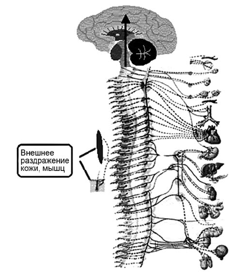 Большинство действий нашего тела контролируются спинным мозгом, заключенным в «футляр» позвоночника. От спинного мозга через отверстия в дужках позвонков отходит 31 пара нервных волокон (8 шейных, 12 грудных, 5 поясничных, 5 крестцовых, 1 копчиковая), которые «обслуживают» те или иные участки организма. Окончания чувствительных нервов прикрепляются к задним отделам спинного мозга, двигательных нервов – к передним. При этом каждая пара нервных волокон контролирует только «свою» область, а вместе они создают «паутину» нервов, чьи рецепторы пронизывают каждый орган и каждую ткань.