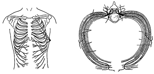 Поясню. Межреберные нервы образуют передние ветви 12 грудных нервов. При этом 6 верхних нервов иннервируют мышцы грудной клетки, а 6 нижних – мышцы брюшного пресса (рис. 5).
