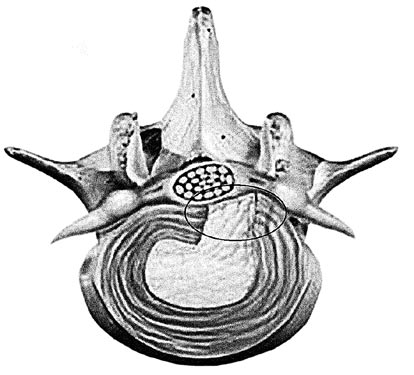 Часто она возникает не только в области поясницы, но и в одной или сразу обеих ногах (средней ягодичной мышце, бедрах и т. д.). Если это так, то мануальный терапевт имеет дело с пояснично-крестцовым корешковым синдромом. Он проявляется в разрыве фиброзного кольца межпозвоночного диска, при частичном или полном выходе его мякотного ядра кзади, а также защемлении окончаний нервных корешков (рис. 6).