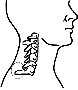 Особенно эффективно такое средство при остеохондрозе шейно-грудного отдела. В этом случае кусочки перцового пластыря следует накладывать на точки, расположенные ниже остистого отростка. Его найти несложно. Сначала надо плавно прижать подбородок к груди (но не в период обострения болей) и концом указательного пальца правой руки провести сзади сверху вниз по средней линии шеи. У ее основания прощупывается выступающий позвонок. Это и есть остистый отросток (рис. 7).