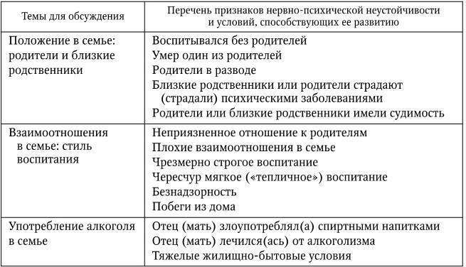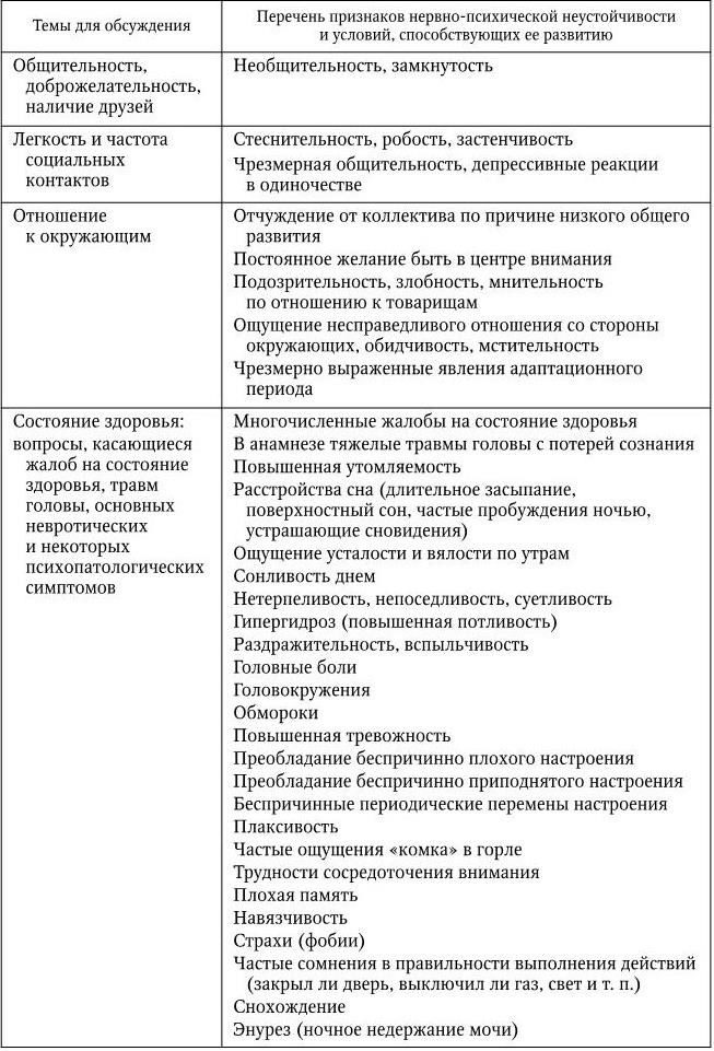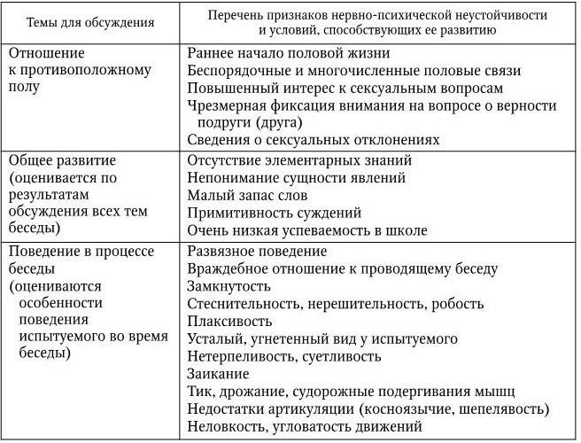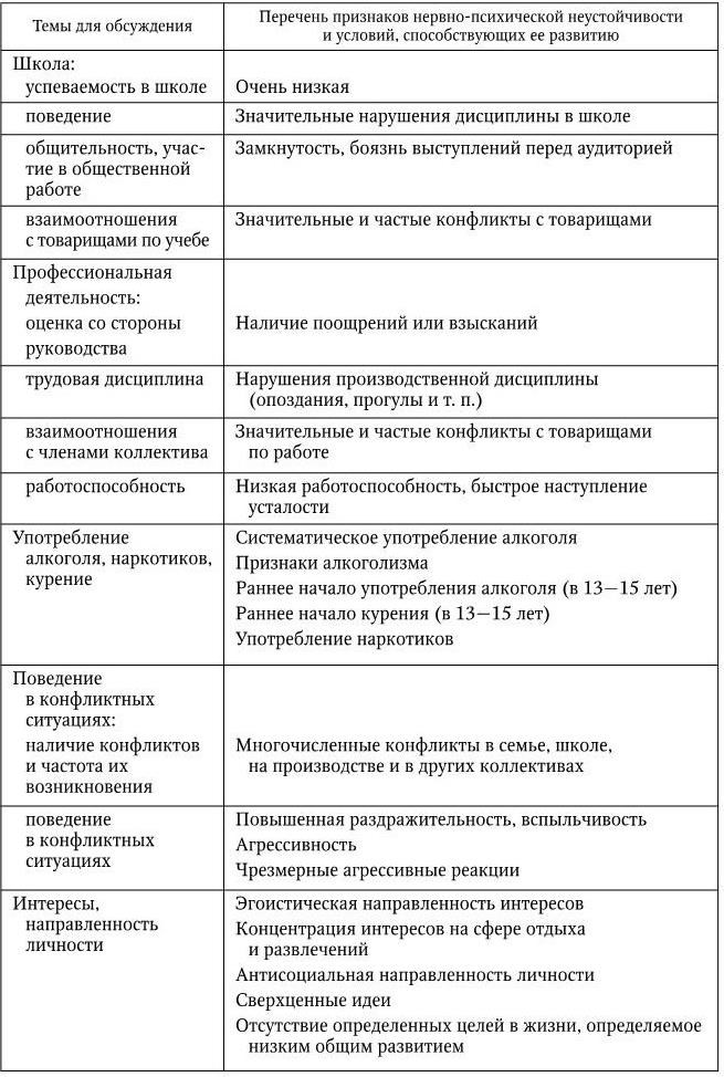 Ниже приведен ориентировочный план беседы (табл. 1), в котором даны темы для обсуждения, позволяющие получить сведения о личности обследуемого и условиях его жизни. План беседы дополняется перечнем признаков нервно-психической неустойчивости, которые могут быть выявлены в беседе и при наблюдении за поведением обследуемого.