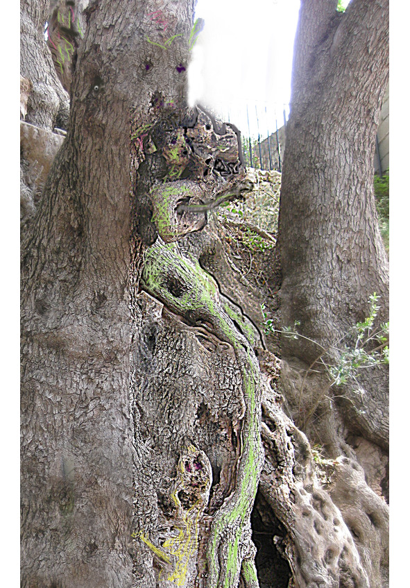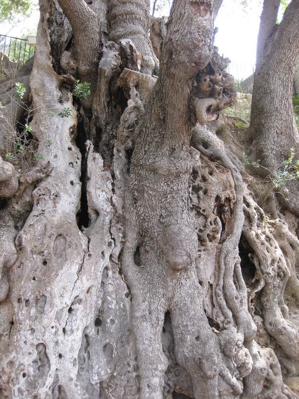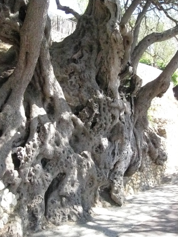 Это не было одним деревом с огромным стволом и широкой кроной, как представляла себе я. Это было несколько десятков стволов и корней, причудливо изогнутых. И все это переплетение представляло собой ширину в метров десять, если не больше! Да, я что-то слышала, что олива такое дерево, которое не погибает никогда, даже полностью обгорев, даже засохнув, она находит силы пустить новые ветки и стволы и живет еще четыре тысячи лет. Этому было только 1000 лет! Поэтому, запас прочности у него еще был.