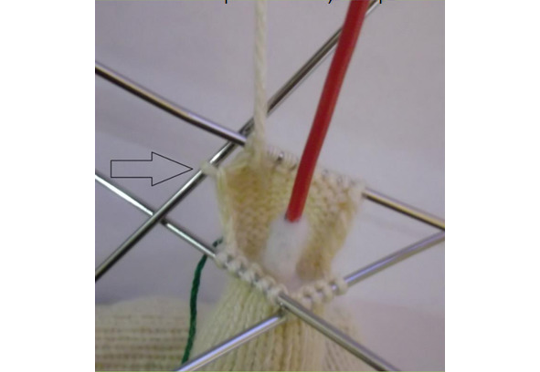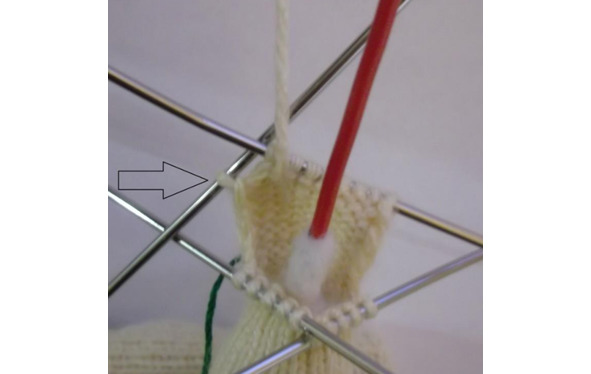 21—24ряды (4ряда): 18лиц. Набиваем наполнителем ручку не слишком туго и продолжаем набивать по ходу вязания.