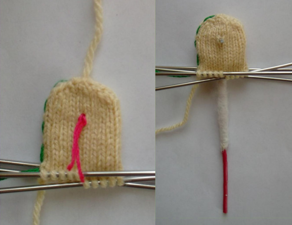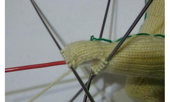 Дальше вяжем вкруговую. Набрать сбоку 5петель, провязать 5 лиц. Поставить маркер начала рядов. 73ряд: 5лиц, с боку набрать 5 петель, 16лиц. = 26лиц. Проволоку согнуть по углом 90 градусов. Хвостик проволоки согнуть вдвое на длину 1,5см от угла, лишнее обрезать, обмотать лейкопластырем.