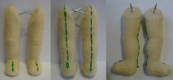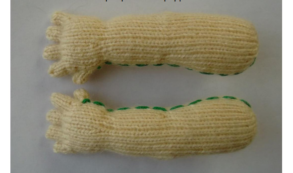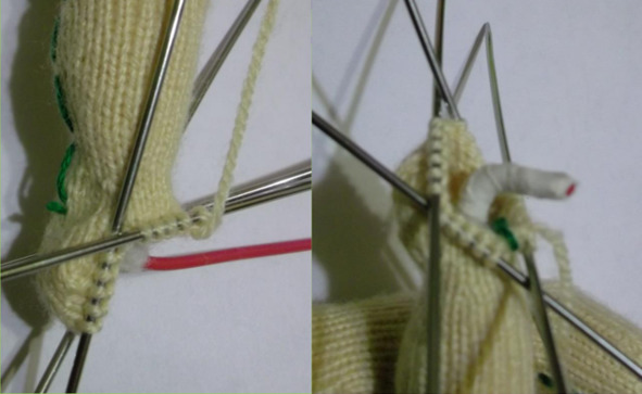 Подготовим крепления для ручек. Две проволочки с петельками диаметр проволоки такой же, как для ножек. Так же делаем петельки на проволоке, закрепляем петельки лейкопластырем и обматываем проволоку синтепоном. Длина проволоки 16см с запасом, длина обмотки синтепоном – 6см. Вяжем вкруговую. Маркер начала рядов проходит вдоль внутреннего сгиба руки. Начинаем вязать с плеча, заканчиваем пальчиками. Зеленой нитью обозначен маркер начала рядов.