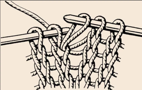 Приб. —скрещенный накид – берем нить в пальцы, формируем из нее петлю и надеваем её на правую спицу и хорошенько затягиваем. В следующем ряду, чтобы не было дырочки в полотне, провязываем за заднюю стенку.