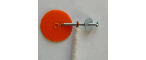 На шплинт надеваем шайбу, потом проволоку, потом диск. В таком виде и будем вставлять в ножку.