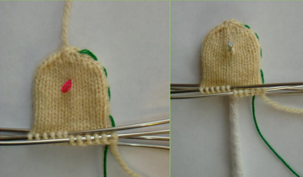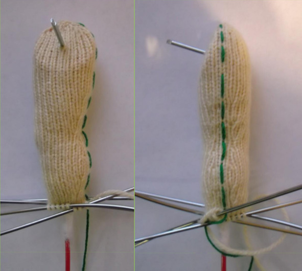 Вяжем вкруговую. Маркер начала рядов обозначен на фото зеленой нитью ипроходит посередине задней части ножки, а после вывязывания пятки, переходит на середину верхней части стопы. Начинаем вязать с бедра, заканчиваем стопой. Набрать 6 петель.