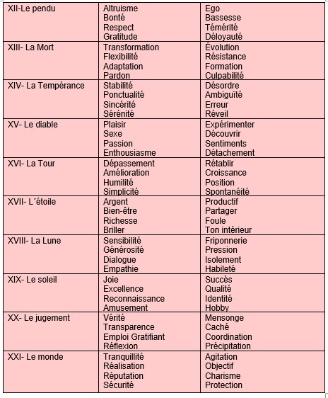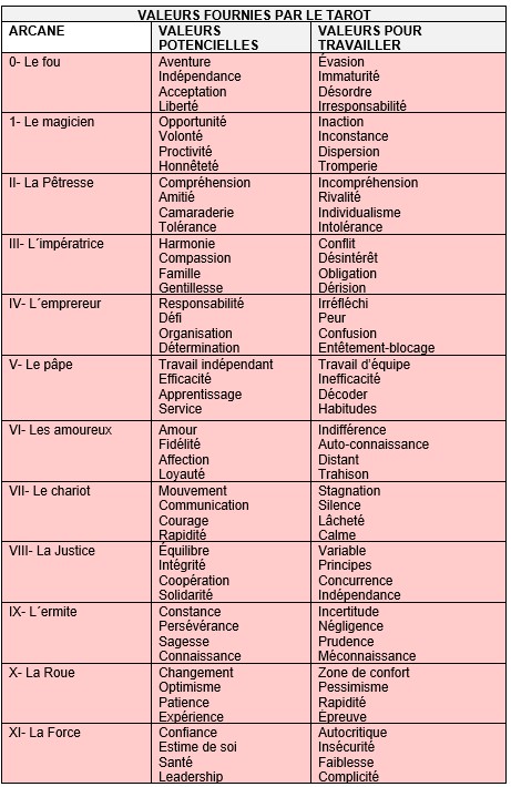 Comme nous avons pu le voir, tout au long du processus de Coaching, on présente une série de valeurs que chaque arcane du Tarot nous montre, qu’il s’agisse de valeurs potentielles ou de valeurs à travailler.