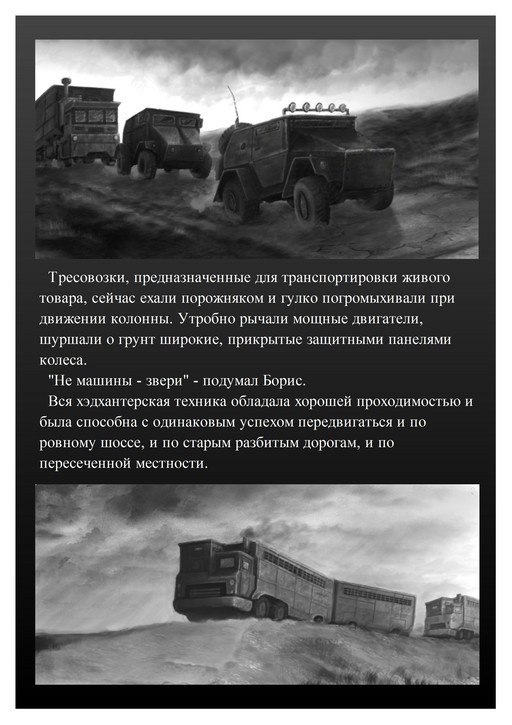 Всего в колонне было восемь машин. Компактный, приземистый, оборудованный хорошей оптикой, быстрый и маневренный бронемобиль разведки, издали казавшийся небольшим подвижным холмиком. Схожий с разведчиком юркий командирский броневичок. Два легких бронетранспортера, набитых хэдами. Неповоротливая частично бронированная фура-вездеход, везущая основной груз группы. Три трес-транспорта – длинные и вместительные, напоминавшие огромные сдвоенные автобусы, этакие коробы на колесах с забранными решетками окнами и отделенными от просторных салонов маленькими водительскими кабинками.