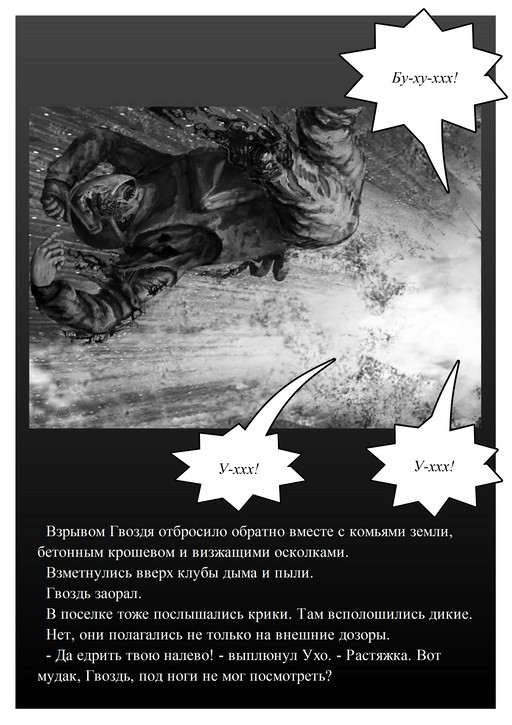 – Рассредоточится, – быстро заговорил Ухо, не глядя на подчиненных и настороженно зыркая глазами по хуторским улицам. – Проверять каждый дом. Действовать парами. Прикрывать друг друга. Соседей из виду не упускать. Диких валить нелеталкой. При обнаружении очагов сопротивления самим на рожон не лезть – блокировать и сообщать мне. На отрытые пространства не высовываться. Под пятиэтажку не подставляться. Заходим к центру слева. И под ноги смотрите, а то тоже напоритесь, как Гвоздь.