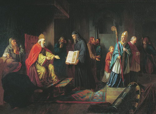 Первые Послы были от Волжских, или Камских, Болгаров. На восточных и южных берегах Каспийского моря уже давно господствовала Вера Магометанская, утвержденная там счастливым оружием Аравитян: Болгары приняли оную и хотели сообщить Владимиру. Описание Магометова рая и цветущих гурий пленило воображение сластолюбивого Князя; но обрезание казалось ему ненавистным обрядом и запрещение пить вино – уставом безрассудным. Вино, сказал он, есть веселие для Русских; не можем быть без него. Послы Немецких Католиков говорили ему о величии невидимого Вседержителя и ничтожности идолов. Князь ответствовал им: Идите обратно; отцы наши не принимали Веры от Папы. Выслушав Иудеев, он спросил, где их отечество? «В Иерусалиме, – ответствовали проповедники: – но Бог во гневе своем расточил нас по землям чуждым». И вы, наказываемые Богом, дерзаете учить других? – сказал Владимир. – Мы не хотим, подобно вам, лишиться своего отечества. – Наконец, безымянный Философ, присланный Греками, опровергнув в немногих словах другие Веры, рассказал Владимиру все содержание Библии, Ветхого и Нового Завета: Историю творения, рая, греха, первых людей, потопа, народа избранного, искупления, Христианства, семи Соборов, и в заключение показал ему картину Страшного Суда с изображением праведных, идущих в рай, и грешных, осужденных на вечную муку. Пораженный сим зрелищем, Владимир вздохнул и сказал: «Благо добродетельным и горе злым!». Крестися, – ответствовал Философ, – и будешь в раю с первыми.
