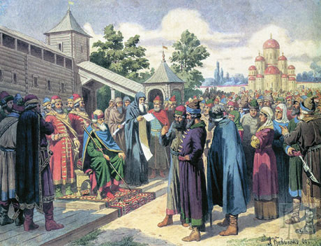 Ярослав Мудрый зачитывает закон народу. Худ. А. Кившенко