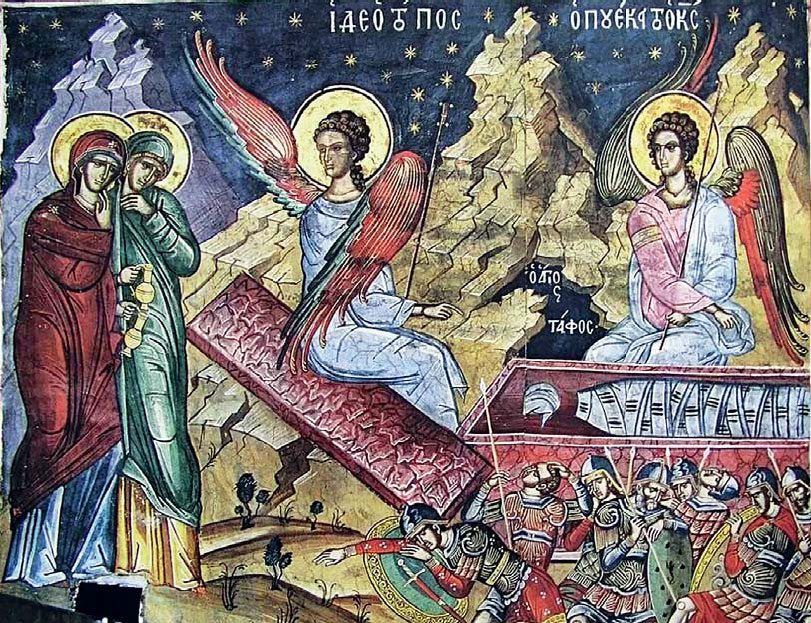 Явление Христа женам-мироносицам. Фреска. XIV в. Монастырь Дионисиат, Афон
