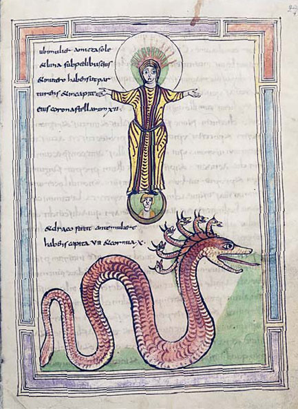 «Жена, облеченная в солнце, и дракон». Книжная миниатюра, Апокалипсис. Ок. 801–900 гг. Аббатство Сент-Аман, Франция