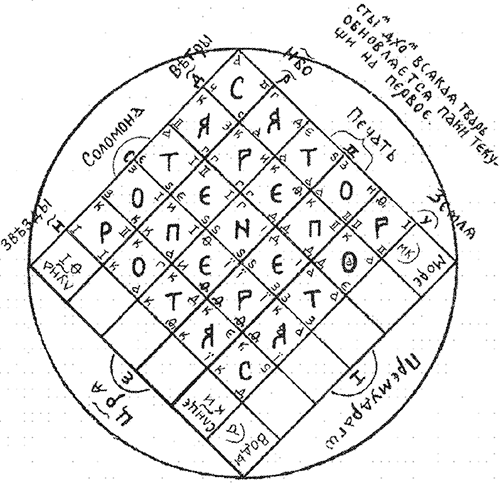 Теперь о самой печати. Я буду употреблять слово «печать» пока только к той её части, где написаны слова «сатор арепо тенет опера ротас». Это квадрат 5 х 5.