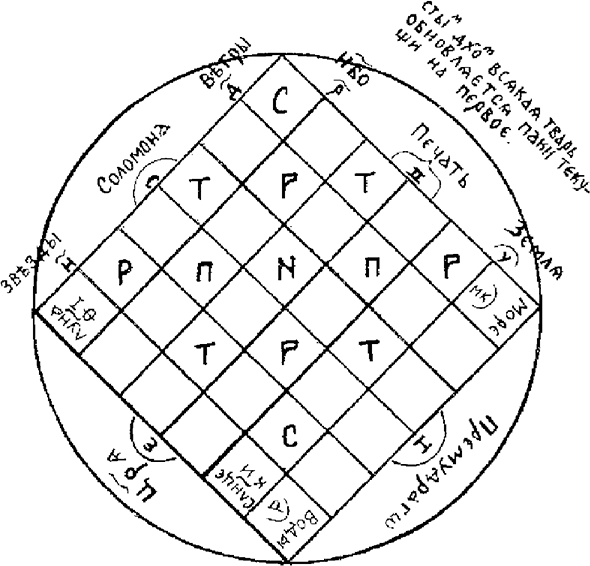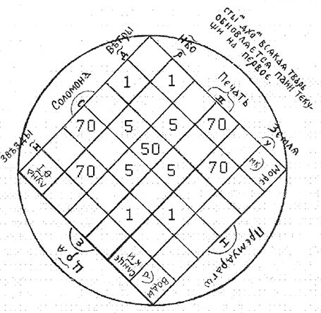 Это печать царя Соломона (рис. 1, взят из [16], т. 2]). Что странного вы видите в ней? Странно то, что Соломон считается иудейским царём, а печать полностью русская. Где вы видели, чтобы заклятия, заговоры, печати, которыми запечатывают, например, джиннов или любые другие Силы, переводили на другой язык, и они сохраняли бы при этом свою силу? Но в данном случае печать Соломона переведена на русский, и она явно рабочая… Значит, она изначально наша, русская?