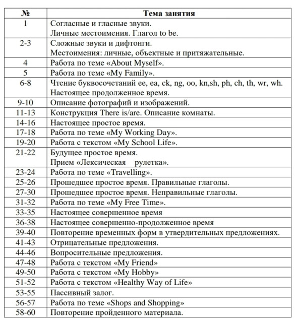 Программа рассчитана на 60 занятий (в неделю 2 занятия по 45—60 минут).