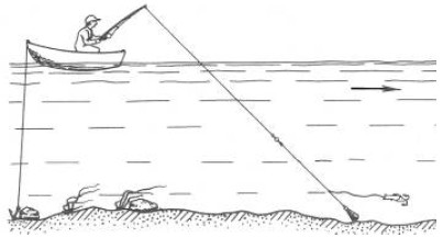 Техника ловли проста: рыболов выплывает на лодке на облюбованный участок реки и становится на якорь (чаще всего на границе тихой воды и быстрины, рядом с омутом или ямой), разматывает наживленную снасть, и, когда грузило касается дна, ставит катушку на тормоз. Грузило вытягивает леску под меньшим или большим углом (в зависимости от силы течения), а живец получает возможность гулять у самого дна на поводке. Если поклевок нет, грузило слегка поднимают над дном, позволяя течению относить его дальше, – и увеличивают таким образом облавливаемую зону. Но если поклевки судаков начались в 15–20 метрах от лодки, имеет смысл сплавиться поближе к стае, подняв якорь либо вытравив его веревку (если, конечно, позволяет глубина – на глубинах меньше 4 метров зависать над головой судаков не стоит, лучше ловить в некотором отдалении).