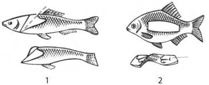 Рис. 3. Приготовление «резки»: 1 – из хвостовой части узкой рыбы; 2 – из боковой части широкой рыбы.