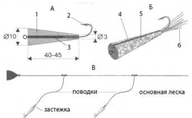 Иногда донки, предназначенные для ловли судака, оснащаются искусственными приманками (на сильном течении). Вот, например, описание конструкции, предложенной волгоградским рыболовом В. Ворониным («Рыболов» № 5/2000):