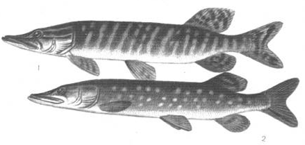 Рис. 1. Щука: 1 —с полосатой окраской; 2 – с пятнистой окраской.