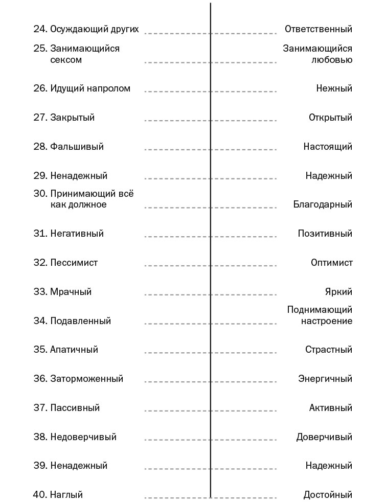 Какими вы обычно видите мир и людей вокруг вас? Возьмите листок бумаги и выпишите в столбик числа от 1 до 40. Оцените людей из вашего окружения по предложенным парам признаков. Вы можете поставить каждому признаку оценку от единицы до пятерки. Если хотите, сделайте это упражнение отдельно для родственников, коллег и друзей.