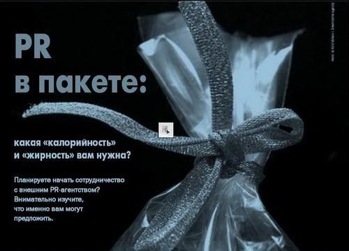 Абонентское PR-обслуживание в агентстве сводится к тому, чтобы с разной степенью интенсивности представлять клиента в информационном поле. Интенсивность напрямую зависит от сумм, перечисляемых в качестве оплаты «за услуги в области связей с общественностью». Если присмотреться к предлагаемым PR-услугам в виде так называемых PR-пакетов повнимательнее, то можно рассмотреть их «градус жирности», «калорийность» и даже «вкус с запахом», а также – что «не каждый PR-пакет полезен».