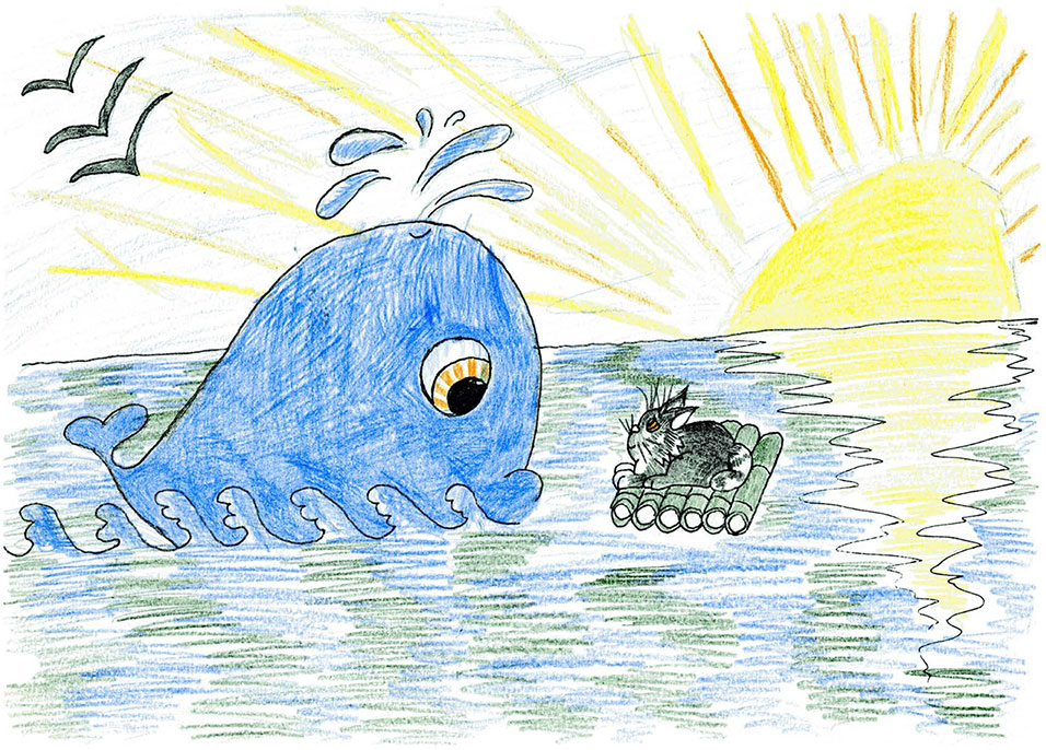 Серый кот соорудил плот из бамбука, росшего здесь же, и решил пересечь море. Он был на полпути к противоположному берегу, когда вода вспенилась, забурлила, и из морской пучины вынырнул кит. «Здравствуй, приятель, – сказал исполин, и от громкого баса его у кота заложило уши. – Первый раз встречаю такого чудного зверька, как ты». «Я – кот, – гордо сказал кот, хотя по сравнению с китом он казался крошечным. – В поисках своего имени я отправился в далекое путешествие и не знаю, куда приведет меня дорога. Прошу помощи у тебя, о повелитель морских вод». Задумался кит: