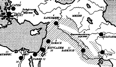 Финикийские цари, считая, что Египет является меньшим злом, пошли на союз с фараоном. Вся Передняя Азия вплоть до Евфрата оказалась под властью египтян. Фараон Нехо II восстановил азиатские владения Тутмоса III, но удержать власть над огромной территорией не мог. В 605 году до нашей эры он был разбит Навуходоносором (605 – 562 гг. до н.э.), тогда еще наследником престола Вавилонии.