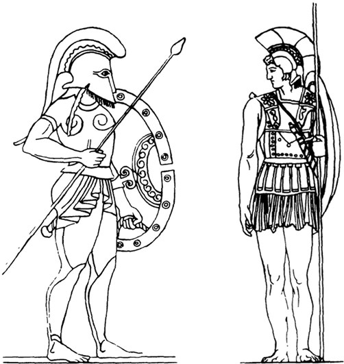 Греческие латники. Бронзовый панцирь скреплялся из двух половин, защищавших грудь и спину; снизу пристегивался кожаный или войлочный передник, часто с нашитыми металлическими полосами. На голове шлем с гребнем: у одного воина с забралом, у другого – с открытым лицом; на ногах у одного – поножи, подбитые кожей. Живот был прикрыт только щитом.