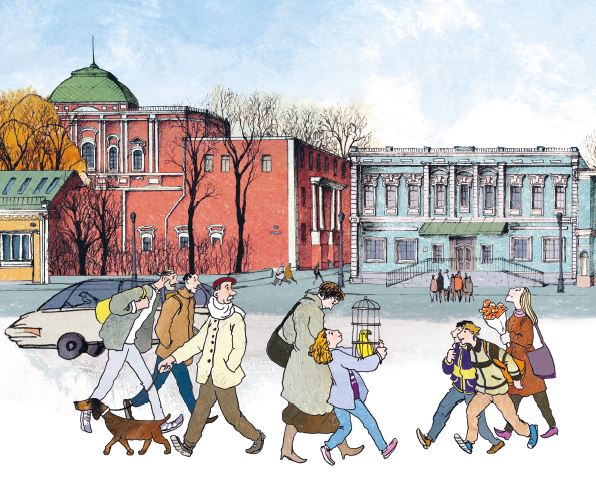 Ну и что, скажут разочарованно многие, где же тут комод? Где ящички для белья, ручки? А дело в том, что нам нужно представить не современный комод, а старинный. И тогда всё сразу станет понятно. Ведь наши потомки называли этот дом не иначе как «Комод на Покро́вке». Если присмотреться, можно увидеть, какая у фасада красивая фигурная линия. Фасад дома не прямой, а изогнутый и действительно напоминает старинный резной комод. Построено здание было в 1768 году, автора точно никто не знает. Такой стиль называют «баро́кко», то есть причудливый, затейливый. Позже здание выкупила семья Трубецки́х, и когда в народе говорили про ту часть семейства, что живёт на Покровке, обязательно уточняли: «Трубецкие-комод». Вот так дом, можно сказать, изменил их фамилию! Родственниками Трубецких были Пушкины, и Александр Сергеевич частенько танцевал здесь на балах.