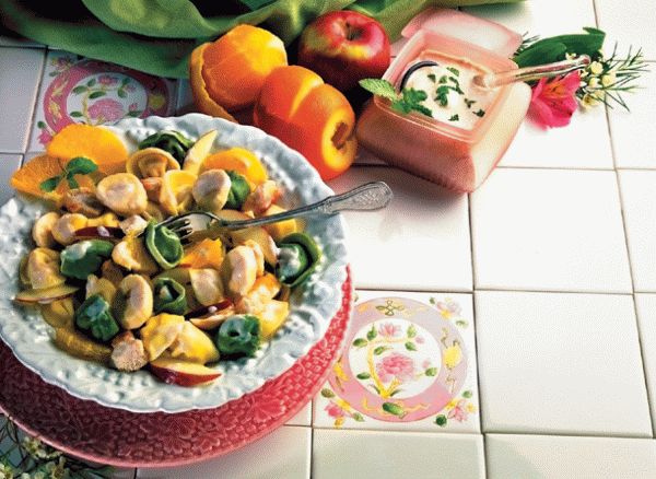 Салат из мяса курицы, фасоли и моркови200 г отварного мяса курицы, 200 г консервированной фасоли, 2 моркови, 1 корень сельдерея, 5 столовых ложек растительного масла, 1 столовая ложка горчицы, 2 чайные ложки винного уксуса, соль по вкусу.