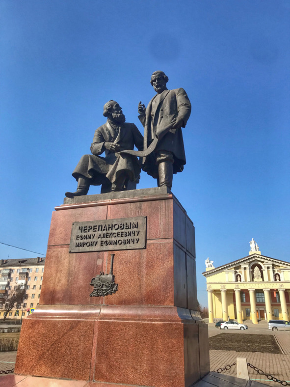 Начинается экскурсия с памятника изобретателям первого российского паровоза Ефиму и Мирону Черепановым. Его вы увидите сразу, когда выйдете на остановке «Драматический театр».