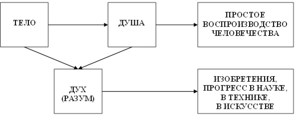 Таким образом, тело в единстве с душой обеспечивают простое воспроизводство человечества, то есть появление новых поколений людей. А в его совокупности с разумом происходит ещё и человеческий прогресс, эволюция общества: наш подъём в науке, технологиях, производстве, культуре, искусстве, поскольку, как уже говорилось, именно разум, присущий только человеку, позволяет ему творить и созидать.