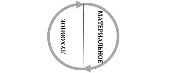 По закону диалектики о единстве и борьбе противоположностей эти две половинки – материальная и духовная – находятся в непрерывном движении, заставляя человека развиваться, приобретать новые знания, творить, создавать всё более новое и лучшее, тем самым совершенствуя себя и мир вокруг. Этот процесс – бесконечный, и каждый раз он возобновляется снова и снова, двигаясь по спирали вверх. Вот почему на всём протяжении существования человечества происходит его постоянное развитие, движение вперёд и прогресс.