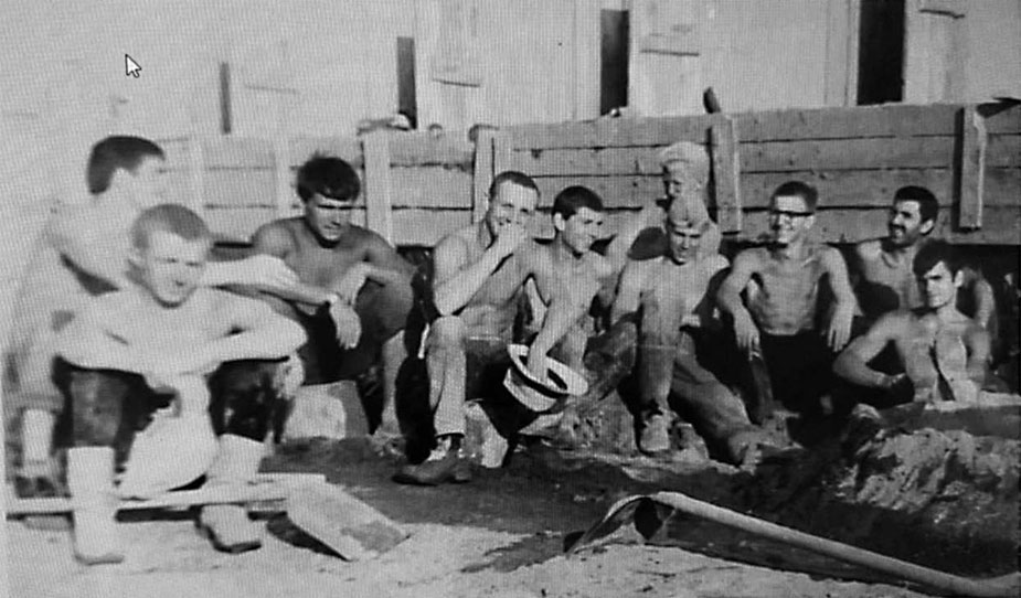 Пишу и вытряхиваю из своей памяти технологические детали, но главным образом – лица моих друзей. Один из них – мастер творить замес Саша Чернов, в 2004 году его включили в энциклопедию «Лучшие люди России», он на первом плане крайний слева. В пилотке – тот, который стойко переносит высокое электрическое напряжение, справа от него – подросток, склонный к правонарушениям. Вовсе он не трудный, просто попал под влияние улицы, мы это поняли во время общения с ним в бригаде, нотаций от нас он не слышал, общались с ним на равных. Неслучайно впоследствии он запросто, как со старыми друзьями, общался с нами в общежитии, прикипел. Крайний справа, на втором плане – отрядный заводила Кума, улыбаясь смотрит в мою сторону, я крайний слева. Самый загорелый среди нас – бригадир Женя Харитонов. Кто-то из друзей кричит: «Скорей бы утро да снова на работу!» (Смех.) Другой: «Лучше нет на белом свете того, чтоб завтра на работу не пойти!»