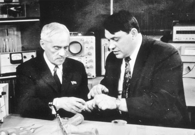 Георгий Александрович Николаев, ректор МВТУ им. Н. Э. Баумана, и Владимир Иванович Лощилов, основатель одной из первых в стране кафедр «Биомедицинские технические системы и устройства», обсуждают технологию резки живых биологических тканей. Москва, 1978 год. Фотография из социальных сетей.