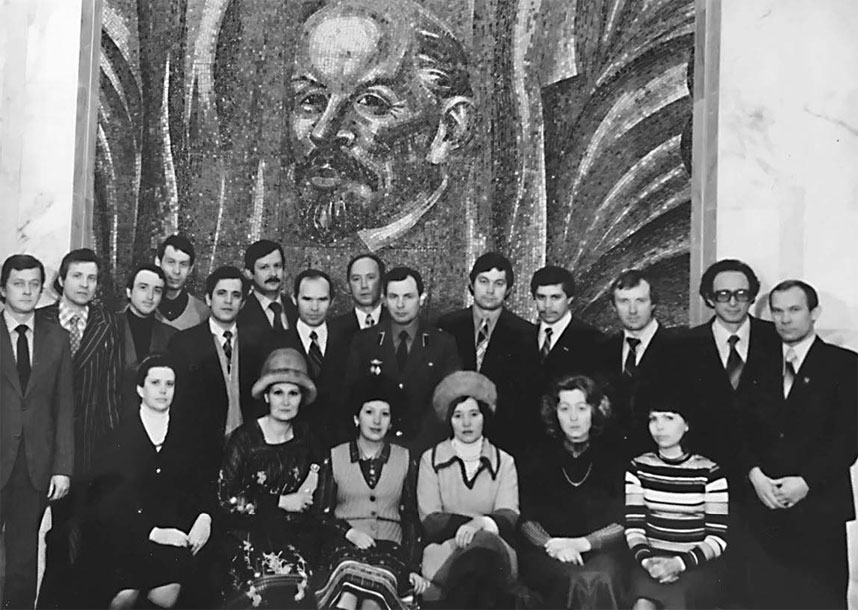 Встреча студентов через десять лет после окончания МВТУ им. Н. Э. Баумана. Первый ряд слева направо: Нина Хомутская, Татьяна Коренченко, Людмила Чумадина, Надежда Самкова, Людмила Аносова, Галина Горелик. Верхний ряд слева направо: Владимир Ткачук, Валентин Клиневский, Игорь Шиганов, Борис Федоров, Шафат Фараджев, Виктор Метельский, Геннадий Давыдкин, Валерий Грязев, Александр Бородков, Улукбек Чиналиев, Марк Шустер, Александр Чернов, Александр Хомутский, Владимир Скопин. Москва, февраль 1981 года. Фотография из личного архива.