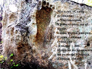 Оставили Боги (создатели нашей расы, представители предыдущей, арийской) и наличие каменного отпечатка стопы великана в селе Чистоводное. Посёлок Чистоводное окружает множество мегалитических объектов, но доступнее всех мегалит со следом стопы великана: