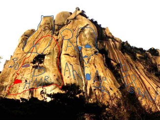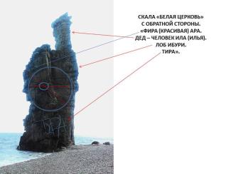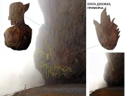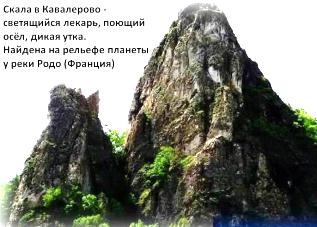 Лвая скала похожа на орущего осла с поднятой вверх мордой. Н алевой просматривается лицо и тело человека. Здесь такой текст: «Билирио нарисовал романс от лиры батхи урара (богу ведомый мир) сансара. Казаров (дикого гуся) голос свирепый крак (трубный глас). Билирио (хранитель супружеских уз) – изумрудный свет его сомати. Его воля стать горой сансары (колеса воплощений и смерти). Мост между жизнью и смертью – великая река. Слышал разговоры и снова ожил. С места слово – дух (ген) его словил. Около рога осла – это око огня из ушей. Красивый голос хаоса – ветер в уши. Любимой свирели голос исходит. Золотой свет божественного мира. Солнца слово – атиры (астероиды) сошли. Ба (душа) сошёл с языка в мир яро. Ом. Это же наш аллатра (дух преображения)». Эту скалу местное население называет «Скала Любви». Судя по тексту на ней, название соответствует смыслу, который она несёт. И она является границей между жизнью и смертью. Были случаи, некоторые бросались со скалы и разбивались. Люди, выходит, чувствуют место перехода. Не удивляйтесь, если увидите ещё другие изображения. Так и задумано Ариями. Мегалиты несут сакральные (тайные, скрытые) знания.