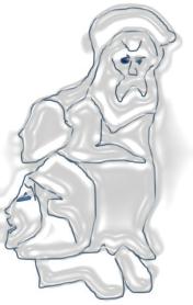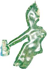 Левый протягивает руку к отверстию в скале. Это и есть остров Пасхи (Хамси). Сутулый справа – кривой Карзай (жестокий): «Кривой Карзай – убийца сиртаки (танца воинов) Агар сити (ныне Ангароа)». Видимо, статуи созданы в честь погибших воинов, и их разбросал Карзай. Если брать только крупные буквы слева – направо, то читаем: «Ари ковчег. Карора (Индия)». Находим на карте Индии Карора, видим портрет принцессы с серёжками (голова с косичками, наклонённая влево) в овале колокола: