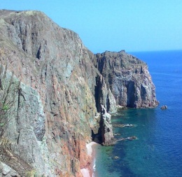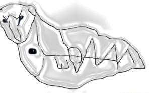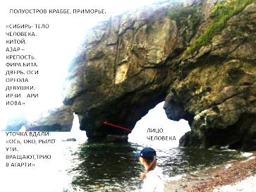Туман помешал сделать чёткие снимки, но зато мы услышали эхо прибоя в скалах. Это означает, что они полые, звучат. Здесь написано, что «Зитса – тор Ара. Зверь. Кров Ара. Заир сбит Арип (мудрый) Ари». Город Зитса находится в Греции, на его рельефе, действительно, нарисован зверь типа норки. При повороте карты, в этом же месте, находится голова «мокрого Ария»: