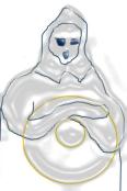 Горловина одежды человека похожа на одну из «личин». На «личинах» ещё удалось прочитать информацию: «Земля – благословенный очаг для всех. От звезды линия очам явила чудо. На реку Бибин рыжие рои астероидов. Овраг, рыло льва. Очи русского копьеносца, статного, красивого. Я вижу лиру ария». Река Бибина находится в Индии. Как обещали, тут есть русич – копьеносец: