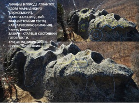 В верхней левой четверти мегалита (камня, проще говоря) видна буква, как прописная английская, произносимая, как Аш. Это древнерусская Н. Здесь находился древний Иерихон. Оледенение заставило народ уйти в Азию и в сторону Африки. Там создавались новые храмы и города с названиями обжитых и брошенных. Названия многих городов по всему миру совпадают и они написаны на мегалитах. Например, Мамре, Мамрин. Меняются только одна, две буквы. Есть в этом комплексе и карта Тартарии из камня: