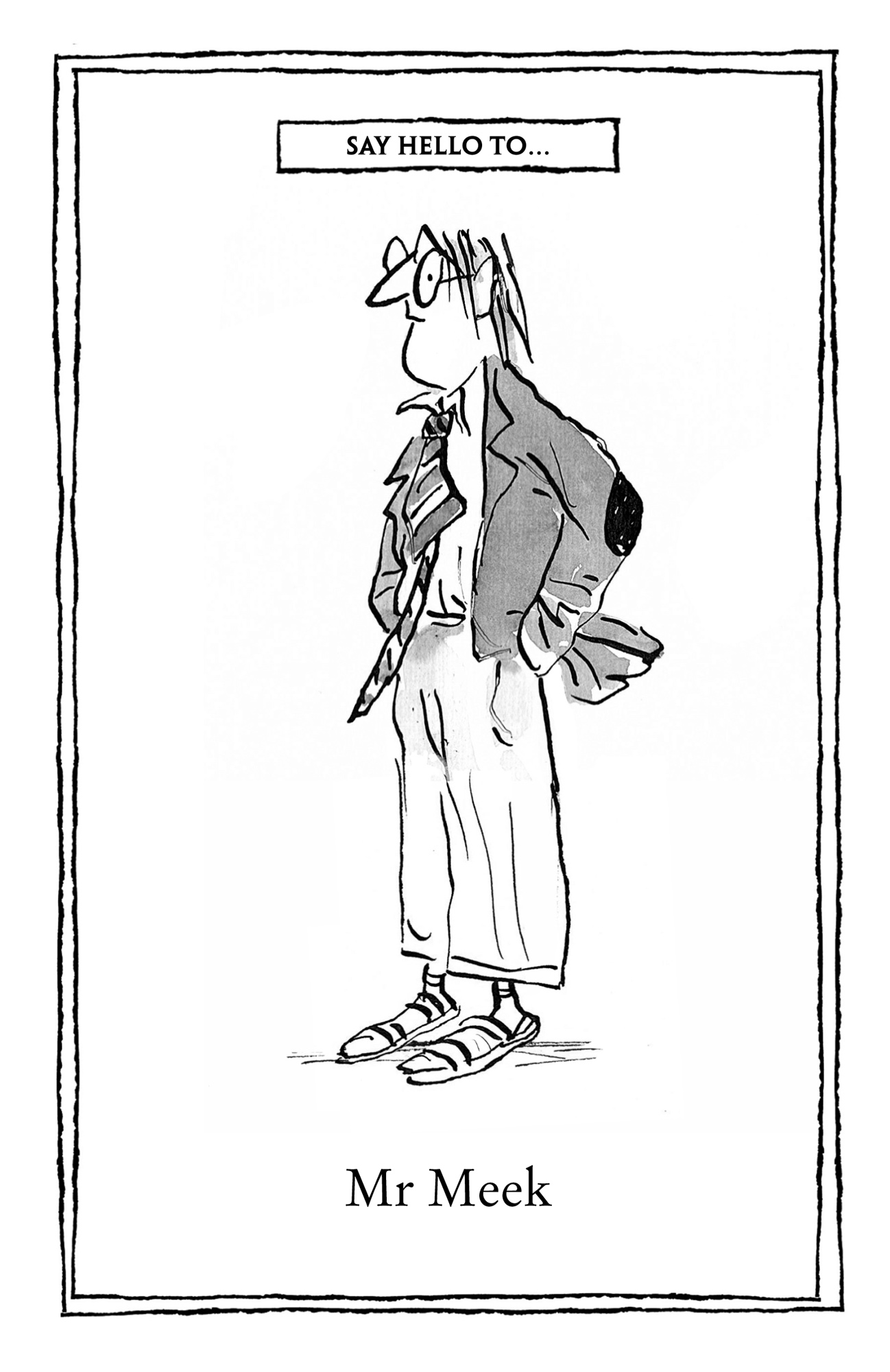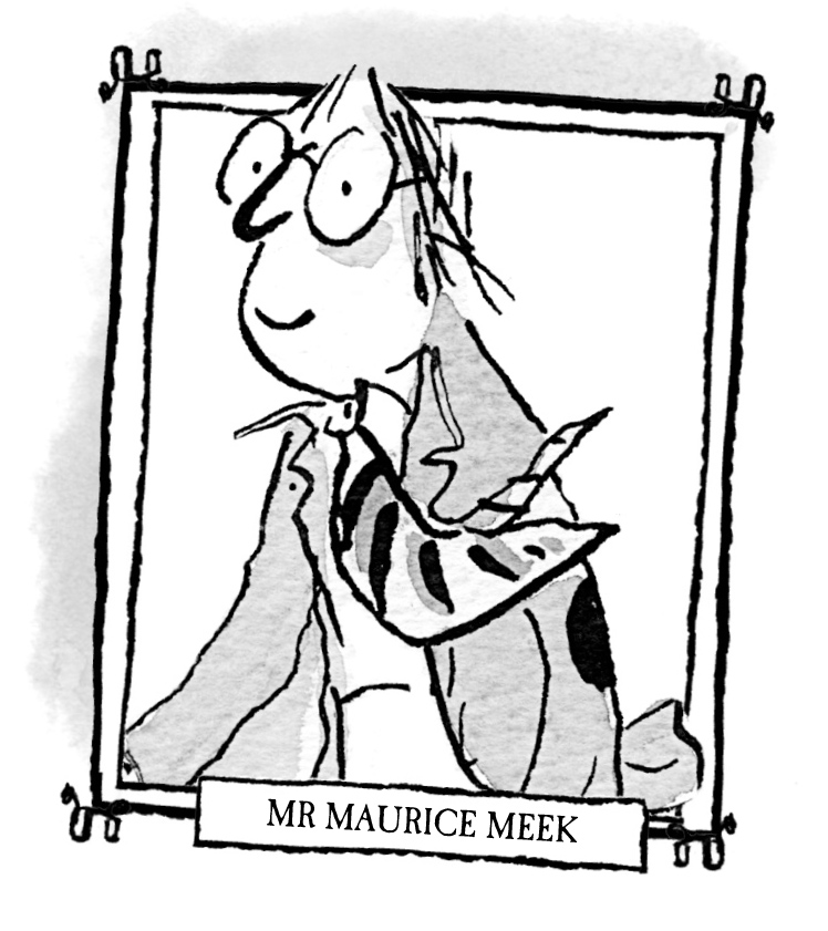 This is Father, Mr Maurice Meek. As his name suggests, Mr Meek is a mild-mannered man. He likes to wear socks with his sandals, and would not dare to eat a peach in public. Mr Meek works as a librarian. He loves LIBRARIES as they are quiet, like him. This is a man who wouldn’t say boo to a goose. Or, indeed, any species of bird.