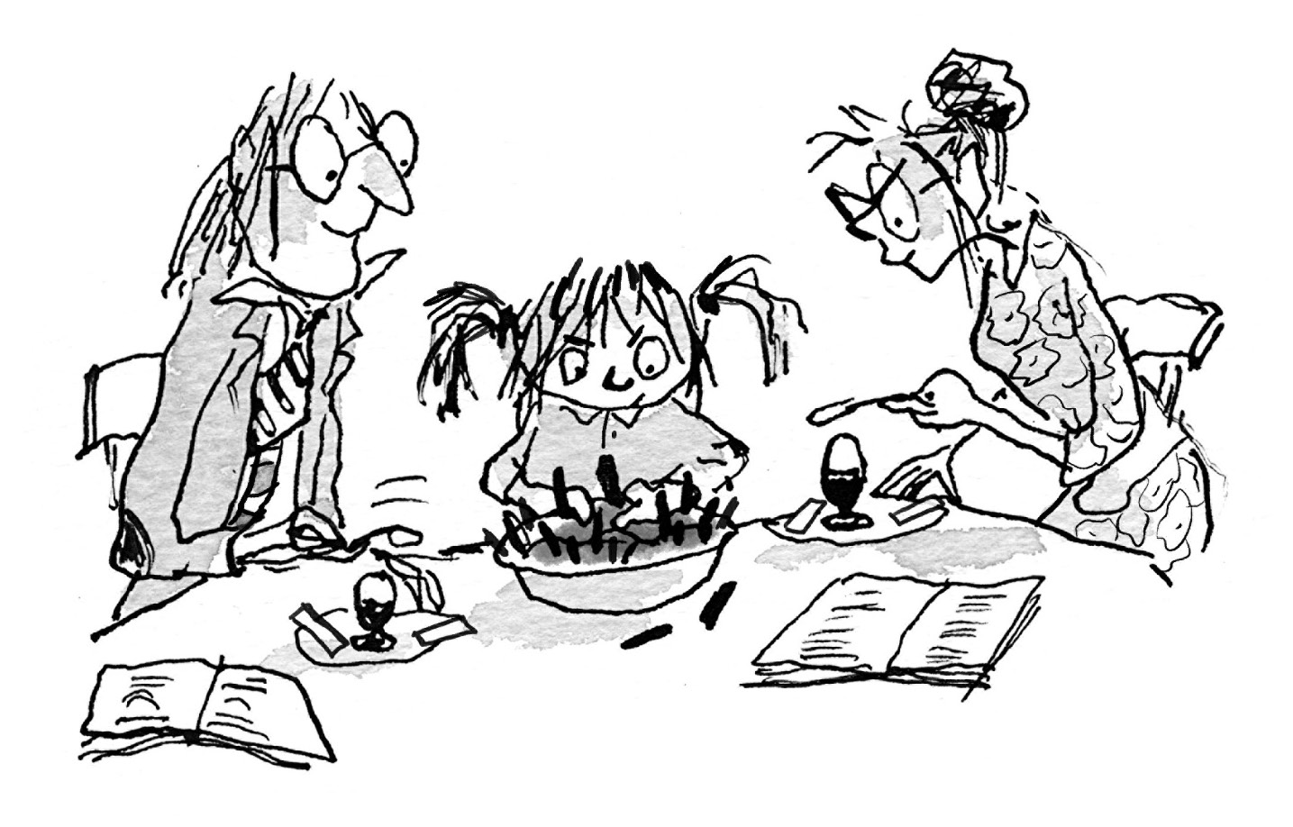 As she grew bigger and bigger and bigger still, Mr and Mrs Meek would feed Myrtle chocolate biscuit after chocolate biscuit after chocolate biscuit. More and more and more. Even though Myrtle would take great delight in spitting the crumbs back in their faces.