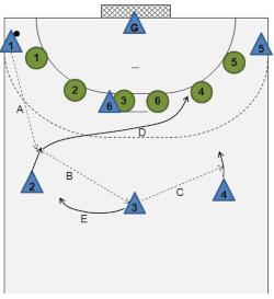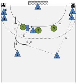 should now clearly move to the right and may potentially pass the ball to , who moves to the other side of in order to place a screen (D). - If this is not possible, the ball should be passed to
