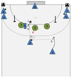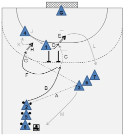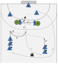 remains passive, may shoot after having moved to the center (G), or pass the ball to (H), who leaves the screening position (J), or play a parallel pass to (K). - The back position players may also pass the ball to the feeders/receivers in order to start the course over.